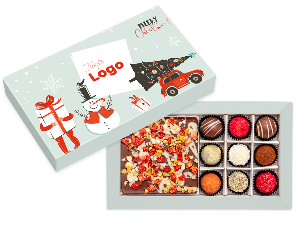 • Zestaw z wyśmienitą czekoladą belgijską oraz 9 ręcznie wytwarzanymi pralinami zatopionymi w czekoladzie i otulonymi różnorodnymi posypkami