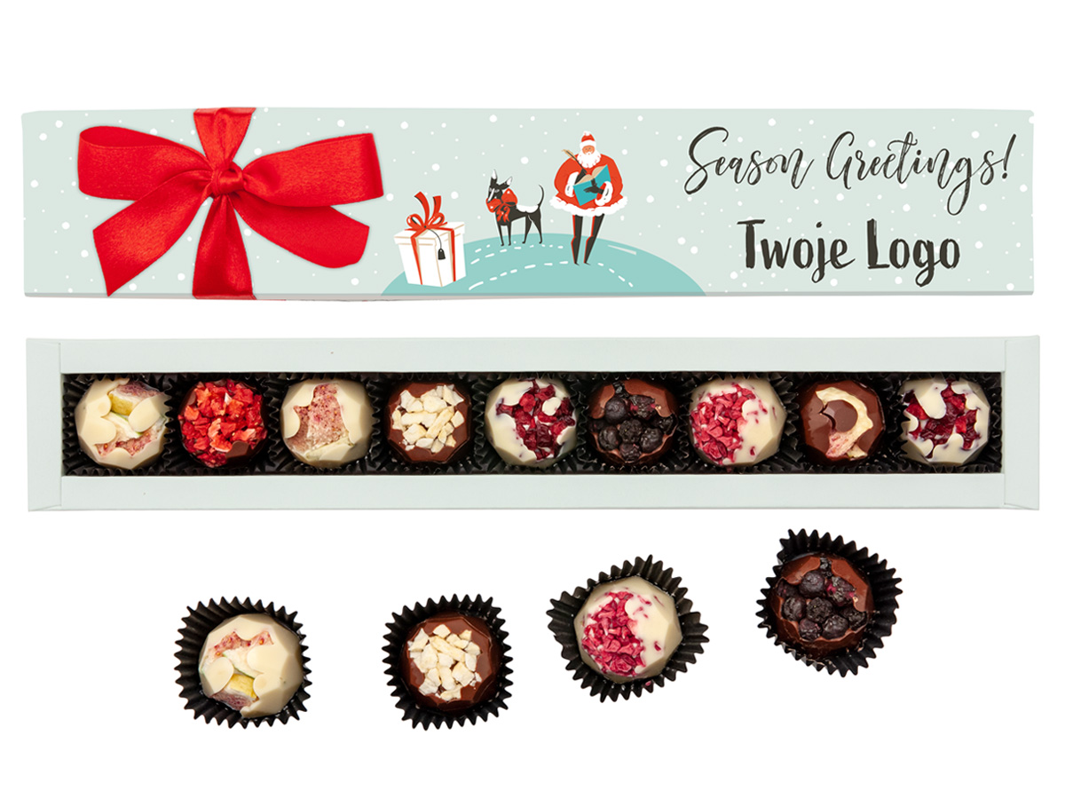 • na wierzchu czekoladek znajdują się owoce liofilizowane (mix dostępnych posypek)