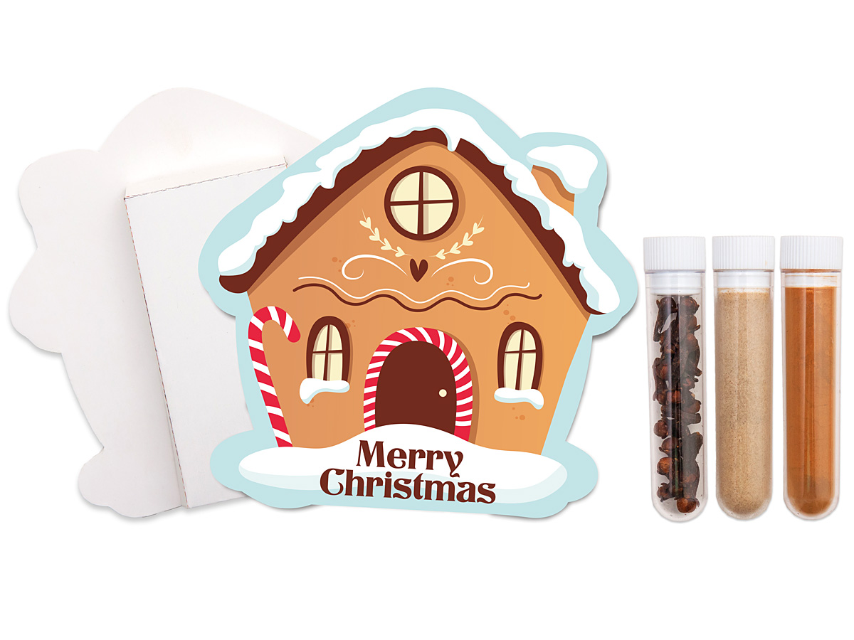 - Aromatyczne przyprawy świąteczne w opakowaniu w kształcie domku z piernika
