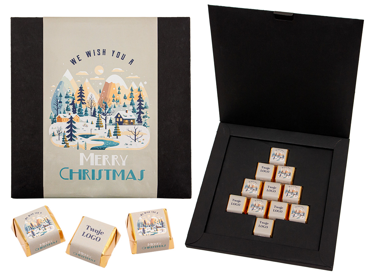 11 czekoladek mlecznych z lekko alkoholizowanymi nadzieniami ułożone na kształt choinki