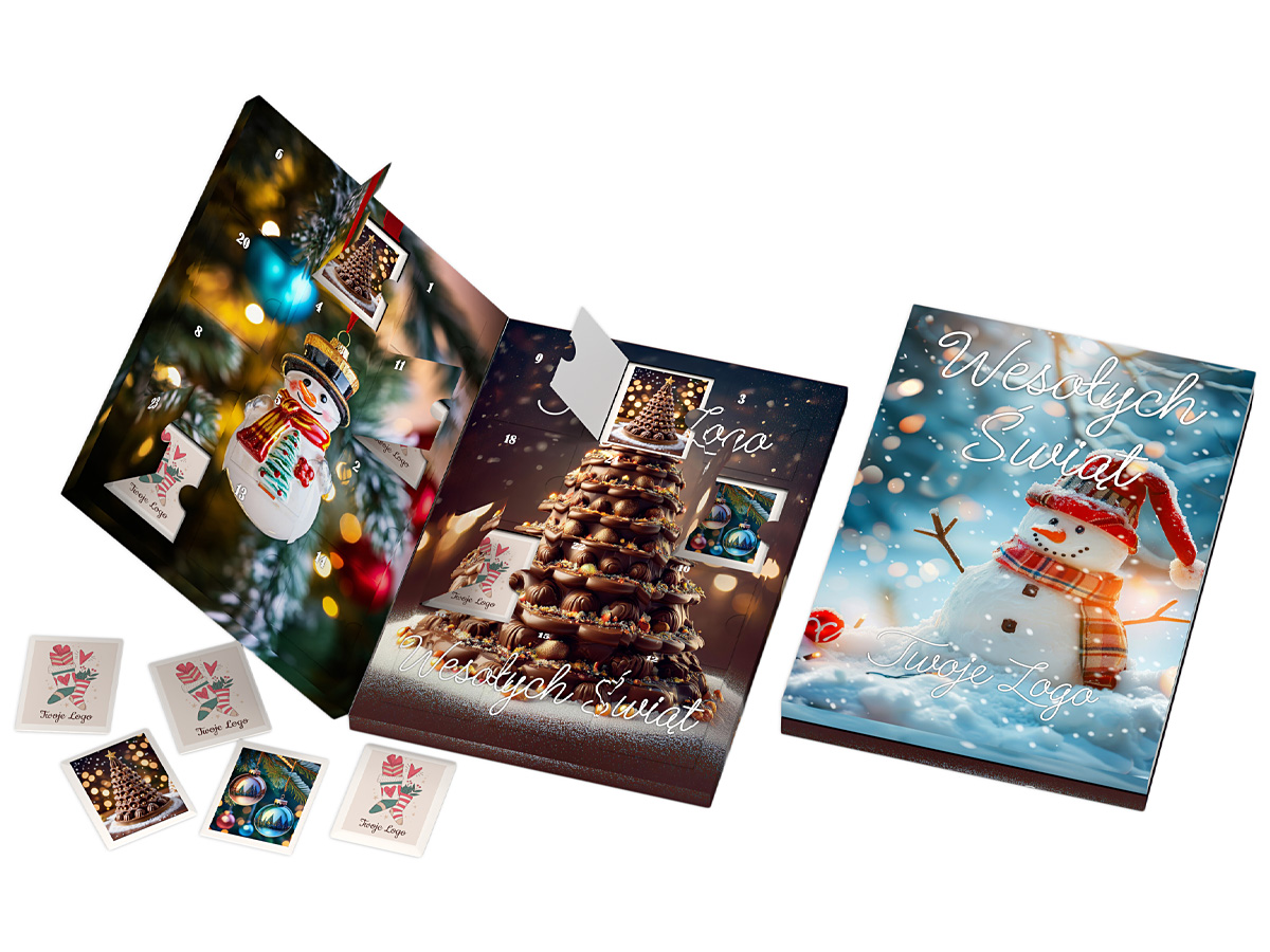 Niezwykle efektowny, bardzo duży kalendarz adwentowy zawierający 24 torebki z herbatą zapakowane w unikalne saszetki z nadrukiem reklamowym
